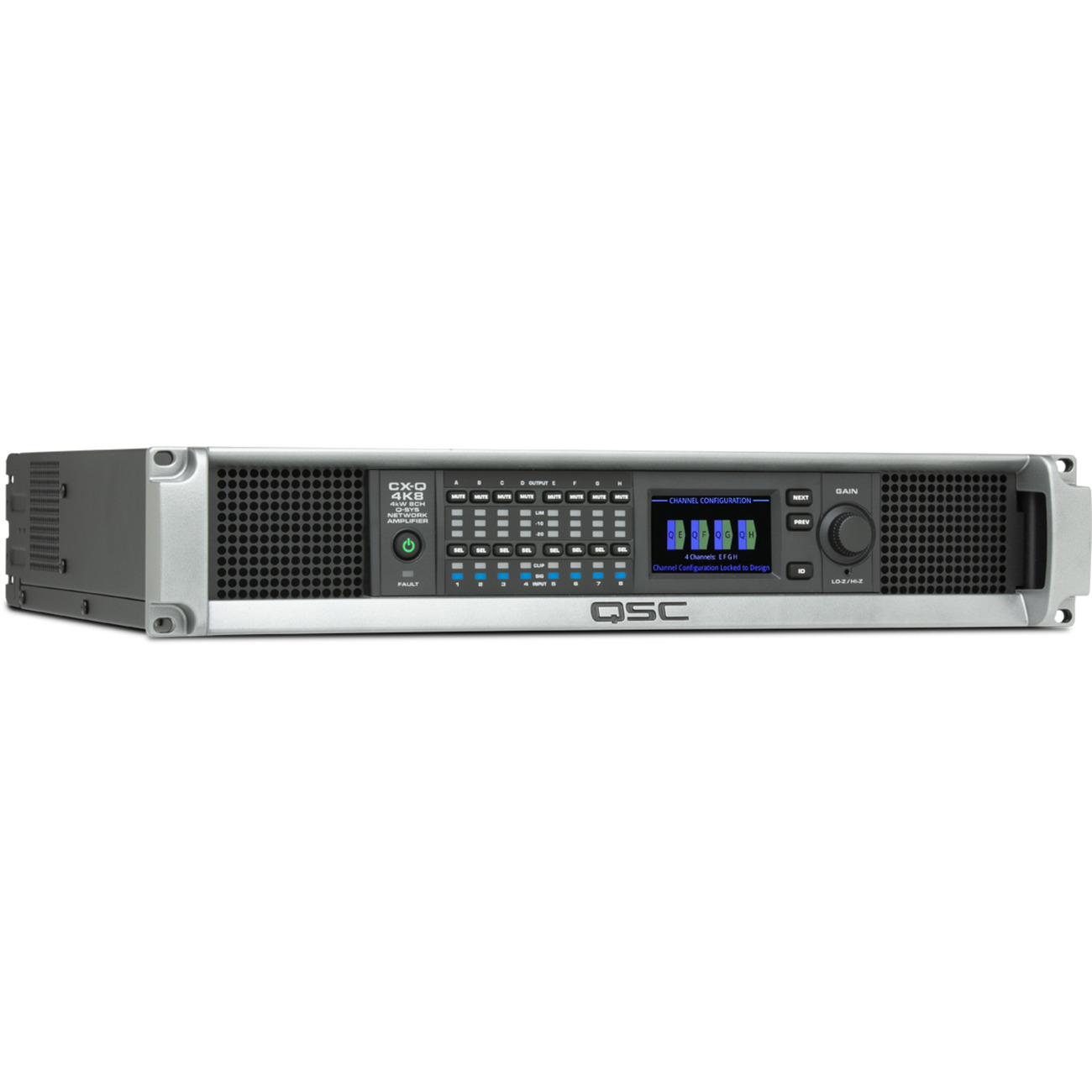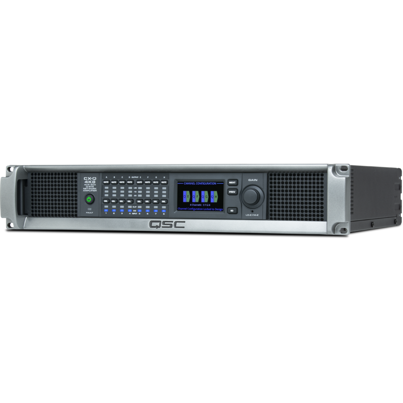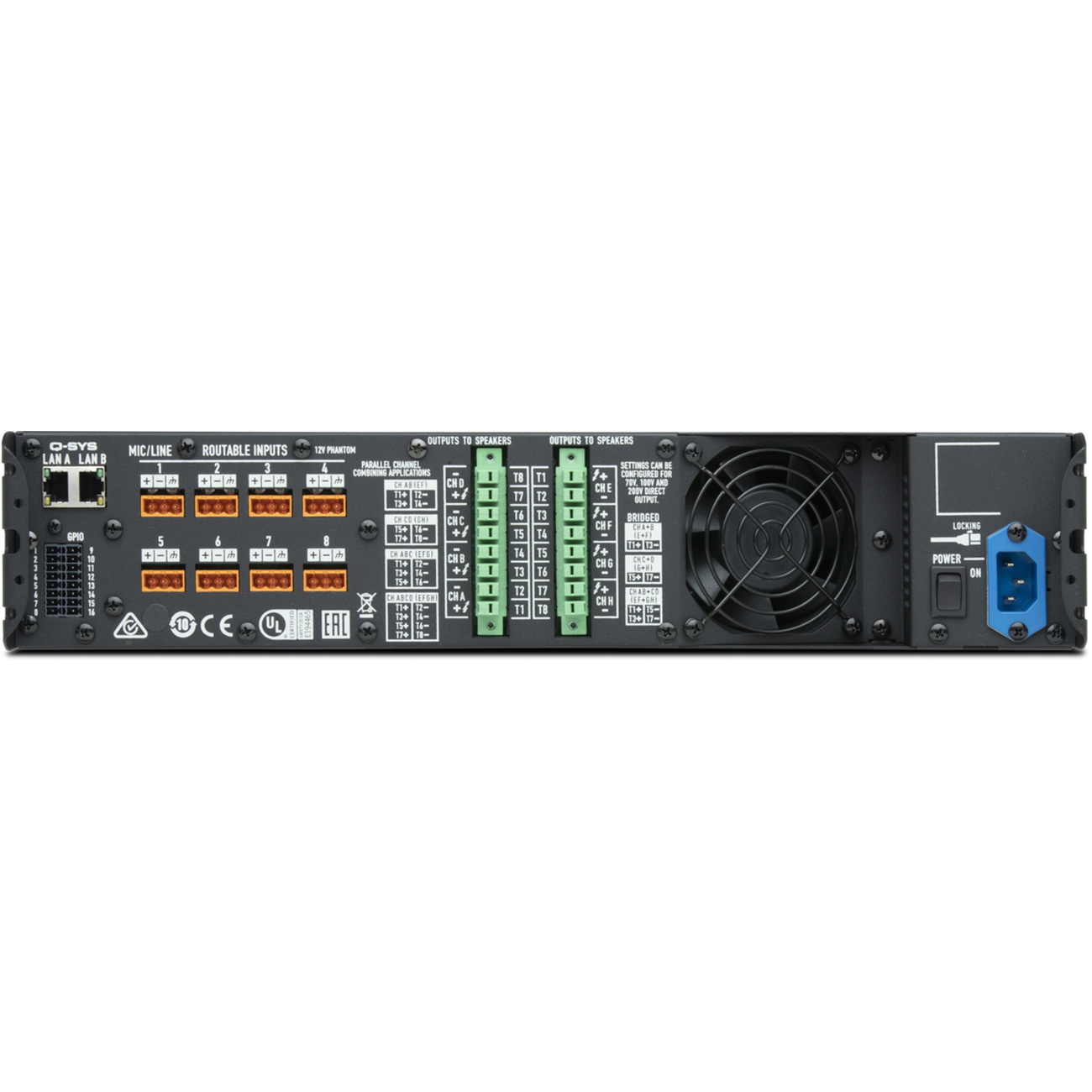 מגבר רשת בעל 8 ערוצים בהספק כולל של 4000 וואט, המכיל DSP מובנה, תומך בשנאי קו 70/100V ואינטגרציה ל-Q-SYS