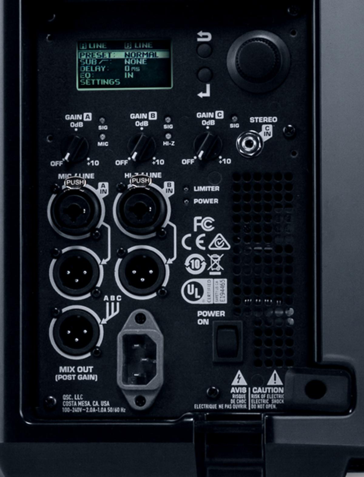 | Connectors | Balanced female XLR/¼⁻ᶦⁿᶜʰ line/mic level input, Balanced female XLR/¼⁻ᶦⁿᶜʰ line level input, Dual Balanced male XLR full range line level out , Balanced male XLR "mix" out, Stereo RCA line level input, Remote gain control, Locking IEC power connector | |||||||||||||||